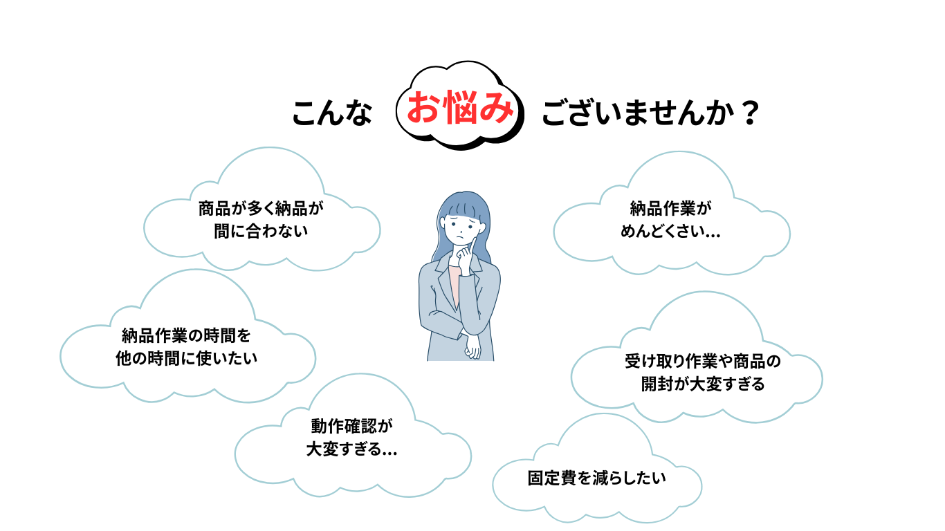 「こゆび梱包」なら、納品作業に関するお悩みを一気に解決します。商品数が多くて納品が間に合わない、作業時間を他の業務に使いたい、動作確認や検品が大変、納品作業が面倒、受け取り・開封作業が負担、固定費を減らしたいといった問題を、すべて代行して効率化。時間と手間を大幅に削減し、ビジネスに集中できる環境を提供します。